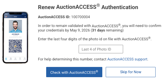 Moving forward, AuctionACCESS will require the last four digits of the photo ID you have on file with them (such as your Driver’s License or Passport) to obtain authentication.